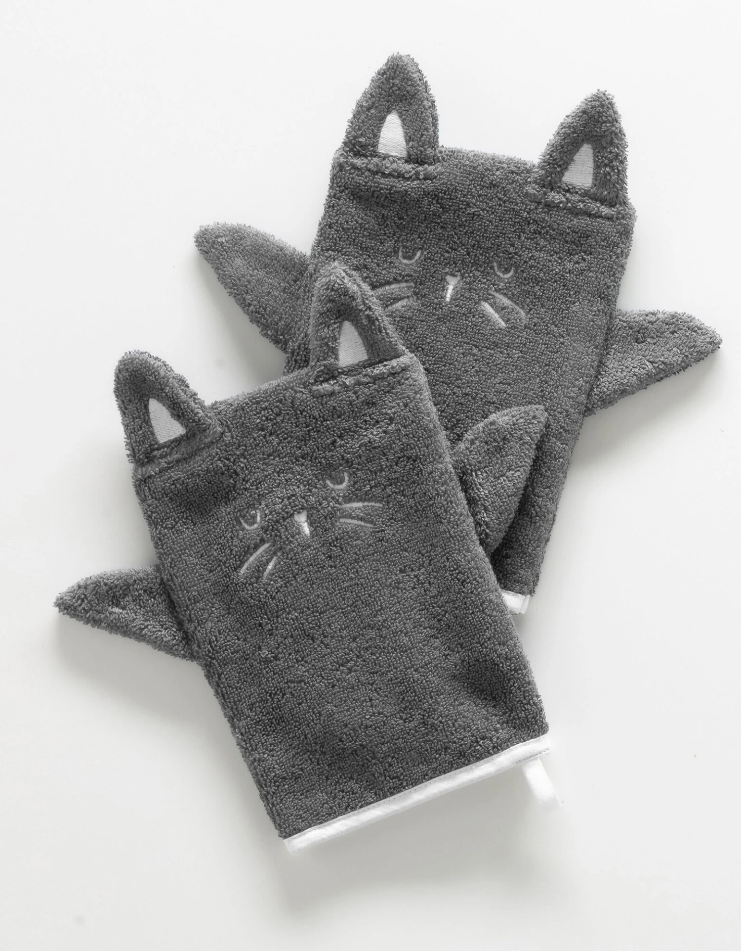 – Lot de 2 gants de toilette « marionettes » 15×21 cm avec oreilles et broderies