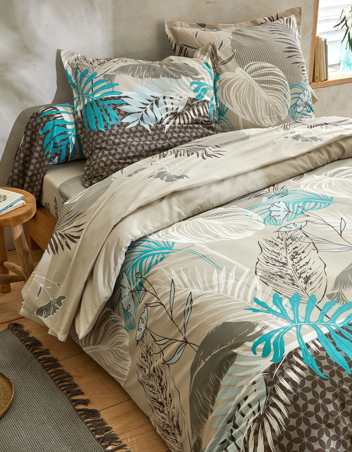 – Housse de couette, motif effet placé, 2 faces identiques. Forme bouteille pour bien border. Existe en grande taille (260×240 cm)