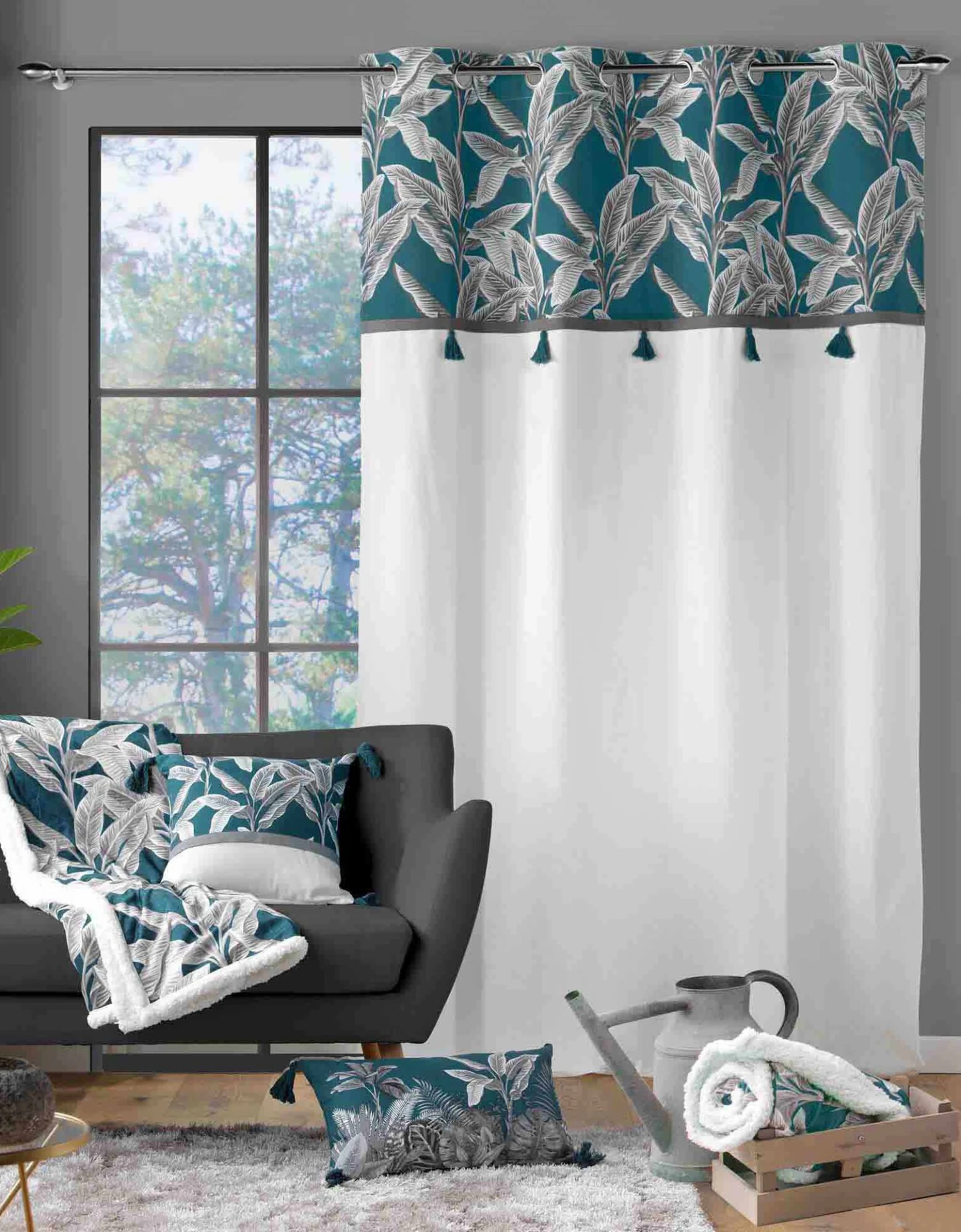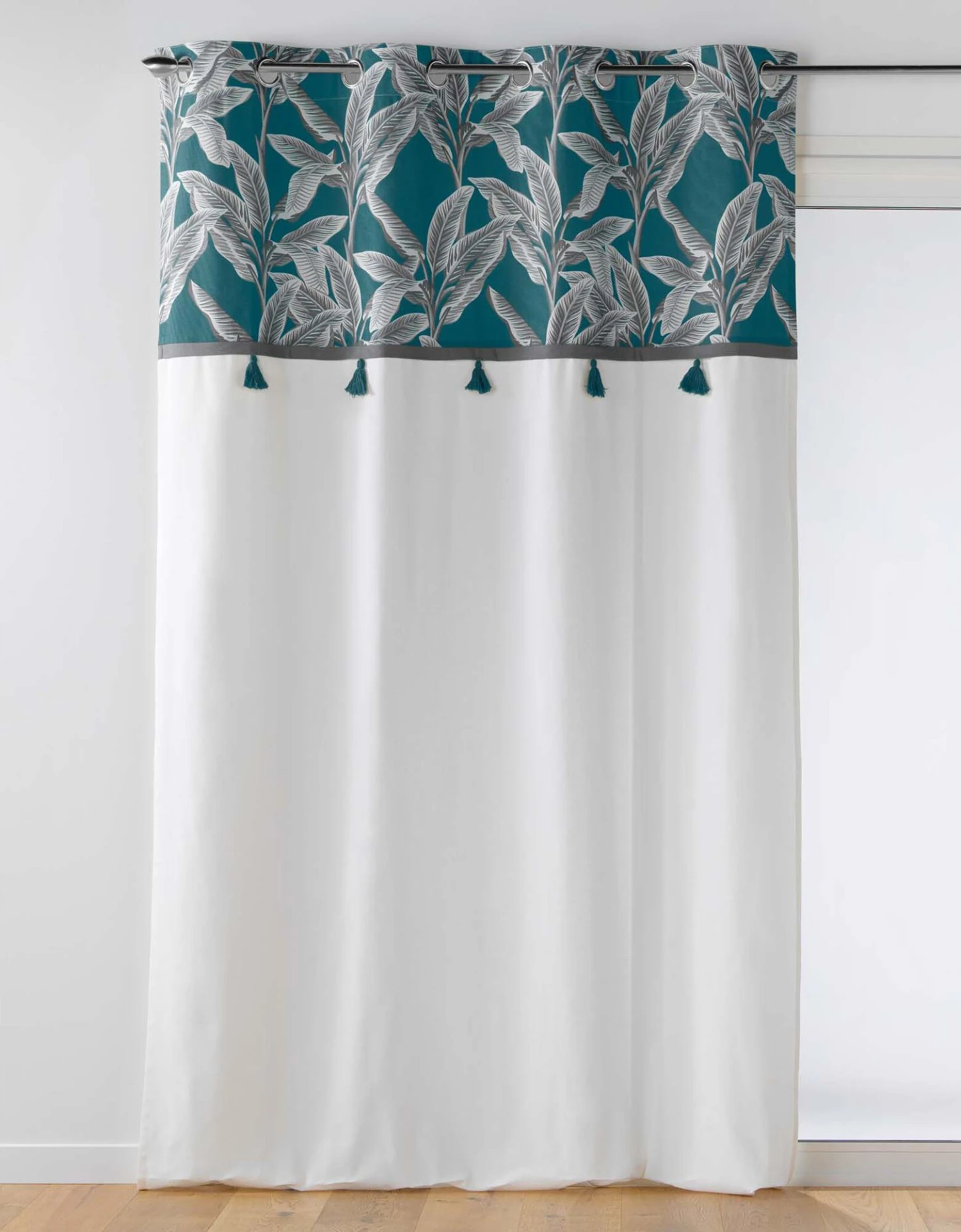 – Liseré uni contrasté souligné de pompons sépare la partie imprimée de la partie unie